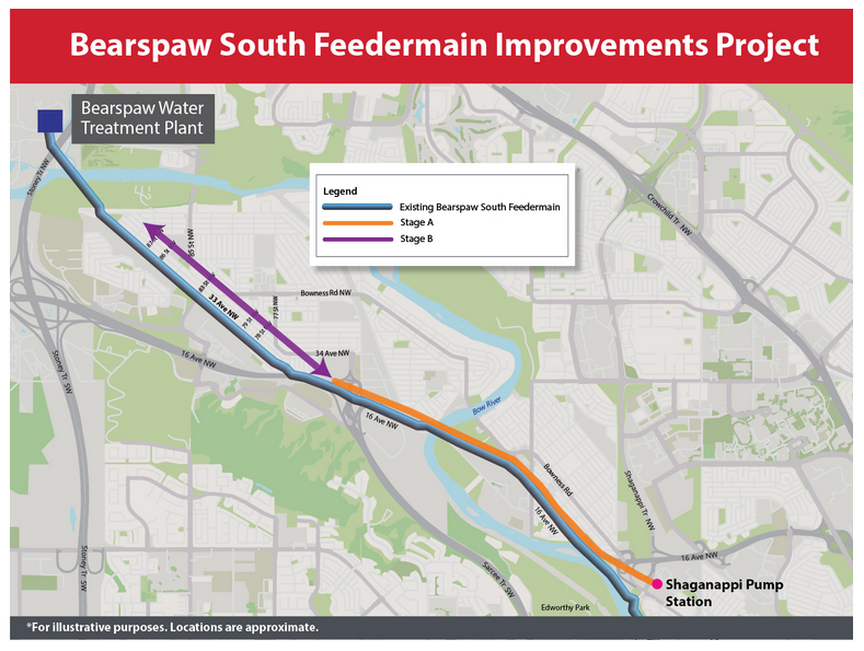 根据卡尔加里市网站,贝尔斯波南支线主要改善项目将分两个阶段完成。第一阶段将需要从Shaganappi泵站到Bow河西侧的73街NW的微型隧道。第二阶段将继续这项工作,沿着33大道移动到89街西北,并有可能延伸到Bearspaw水处理厂。